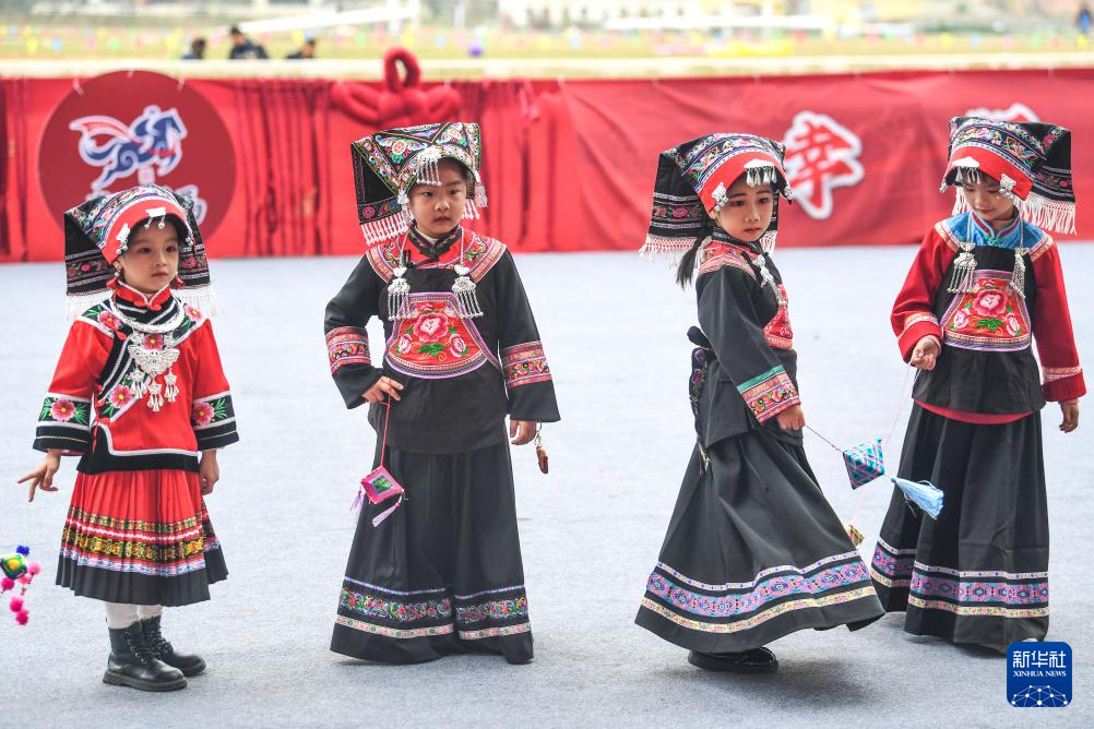 3月7日,孩子们在贵州省三都水族自治县“村马”比赛现场进行民族服饰展演。新华社记者 杨文斌 摄