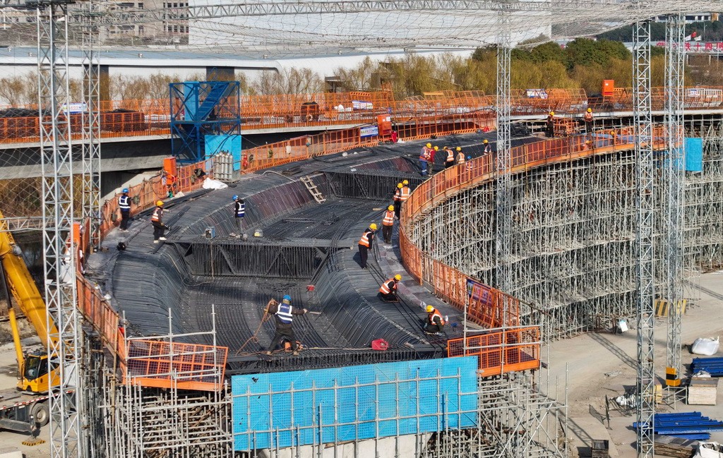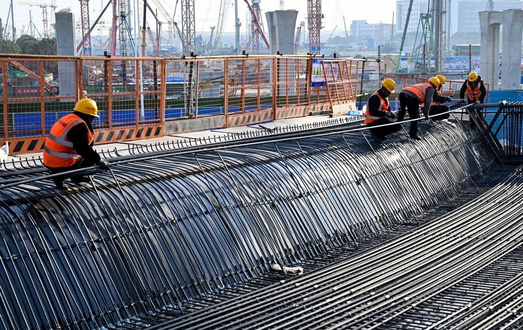 1月12日,中铁十四局工人在苏州东站集疏运系统及连接线工程现浇梁施工现场绑扎钢筋。