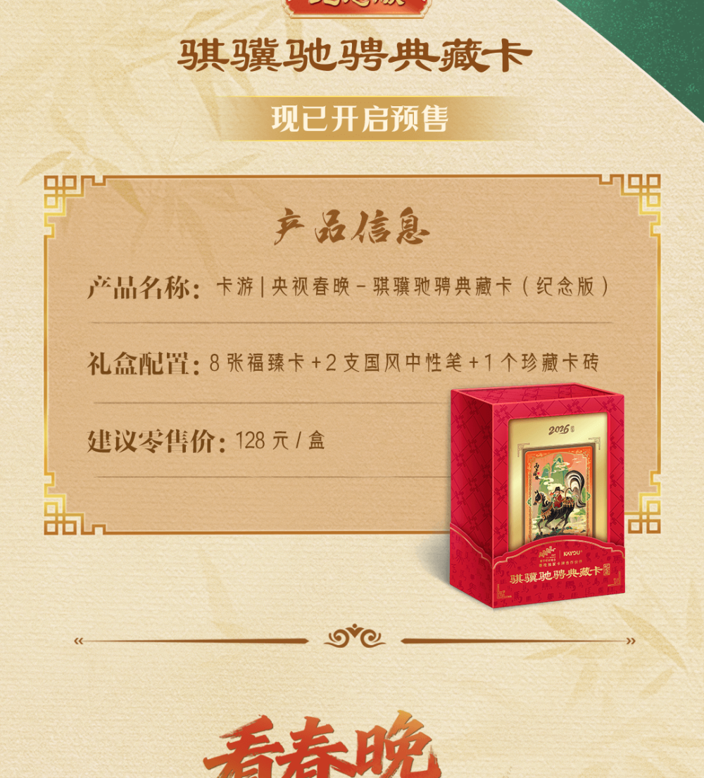 今年一大亮点,当数“骐骥驰骋典藏卡”对年轻人的新邀约。2月5日,中央广播电视总台正式官宣卡游成为2026年春节联欢晚会独家卡牌合作伙伴。这是春晚自创办以来首次设立该合作类别,标志着国家级文化盛典与新时代文创力量的深度联合,也意味着卡牌文创行业从特色文创赛道迈入主流文化消费视野。