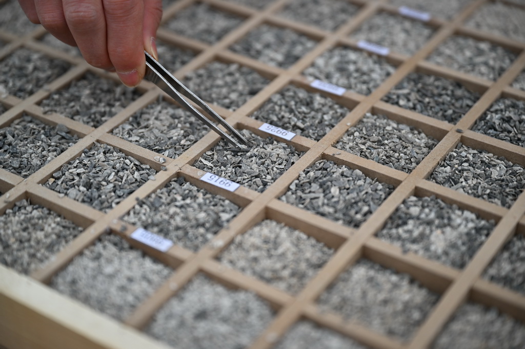 3月3日,科研人员在深地塔科1井研究从地底深处取上来的岩屑。