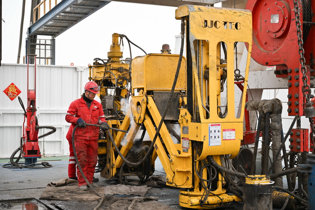 3月3日,工作人员在深地塔科1井协同机械进行钻井作业。