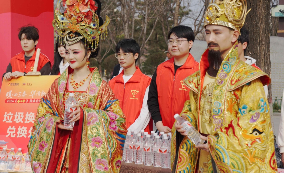“高力士宣圣旨,帝妃出宫视察文明旅游……”“来自大唐皇家宫苑的侍卫和宫女们,手持文明旅游宣传手板在华清广场巡游,同时制止个别游客的不文明行为……”15日下午,在华清宫景区内外,这样的场景吸引了广大市民和游客。