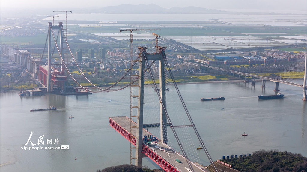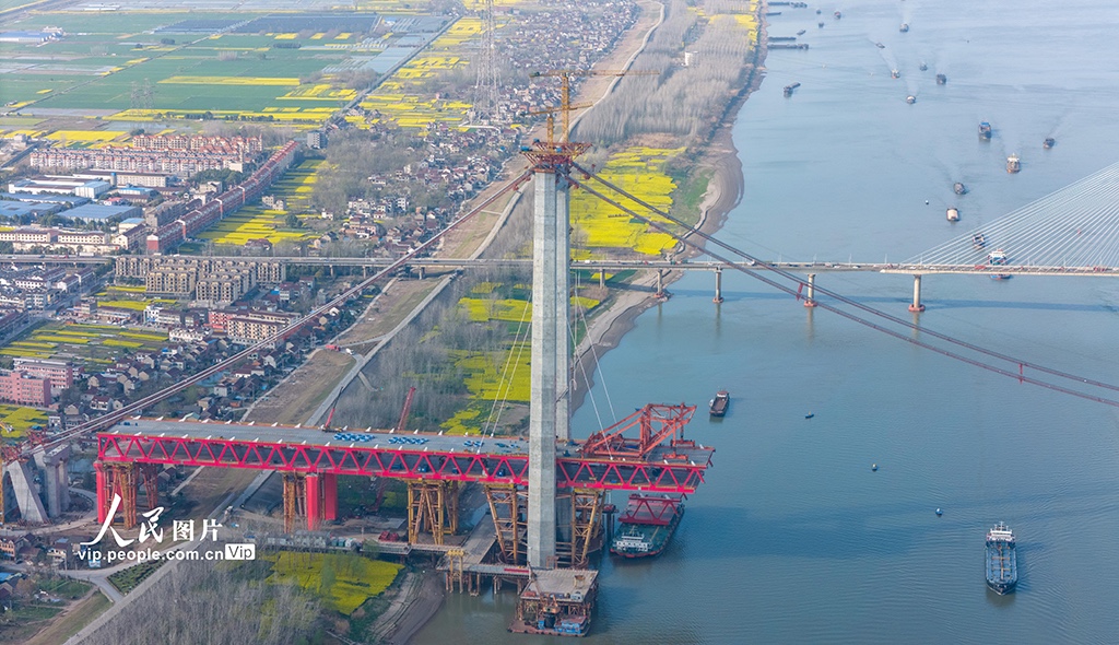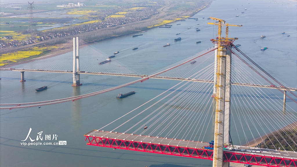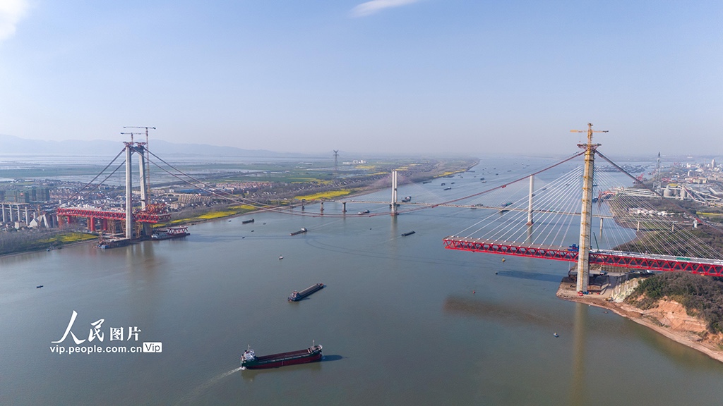 2024年3月22日,在安徽G3铜陵长江公铁大桥施工现场,施工人员在进行主跨钢梁施工作业。目前,大桥进入主跨钢梁施工阶段,预计今年7月完成大桥合龙。大桥全长11.88公里,主跨988米,项目建成后将具有高速公路、城际铁路、货运铁路3种过江功能,对完善区域综合立体交通网具有重要意义。陈磊摄(人民图片网)