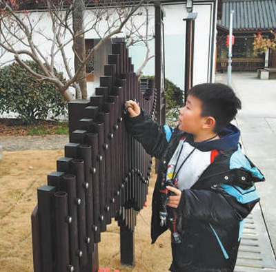 杭州市中泰竹笛展示馆内,小朋友在体验竹笛文化。