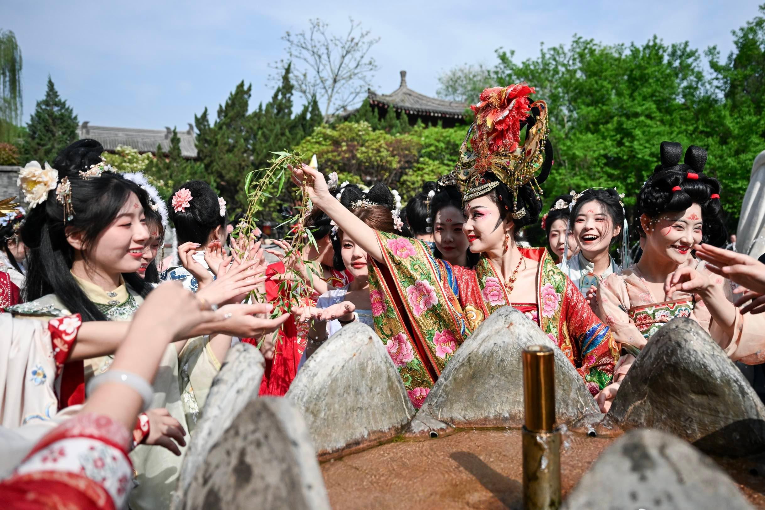 农历三月的华清宫内满目青翠,生机盎然,诸多身穿中国传统服饰的游客们,与众花神一起踏青赏春游园。活动首日,24位国风达人化身花神及探花郎上演唐宫汉服走秀,探花郎不仅为入园游客免费贴花钿、送花环,与游客互动交流、赠送文创礼品。与此同时,在御汤遗址莲花台温泉水池处,“帝妃”以柳枝沾露,轻点花神,祓禊去灾。