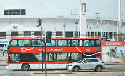 在智利首都圣地亚哥,一辆520路新能源公交车经过2023泛美运动会主场馆。