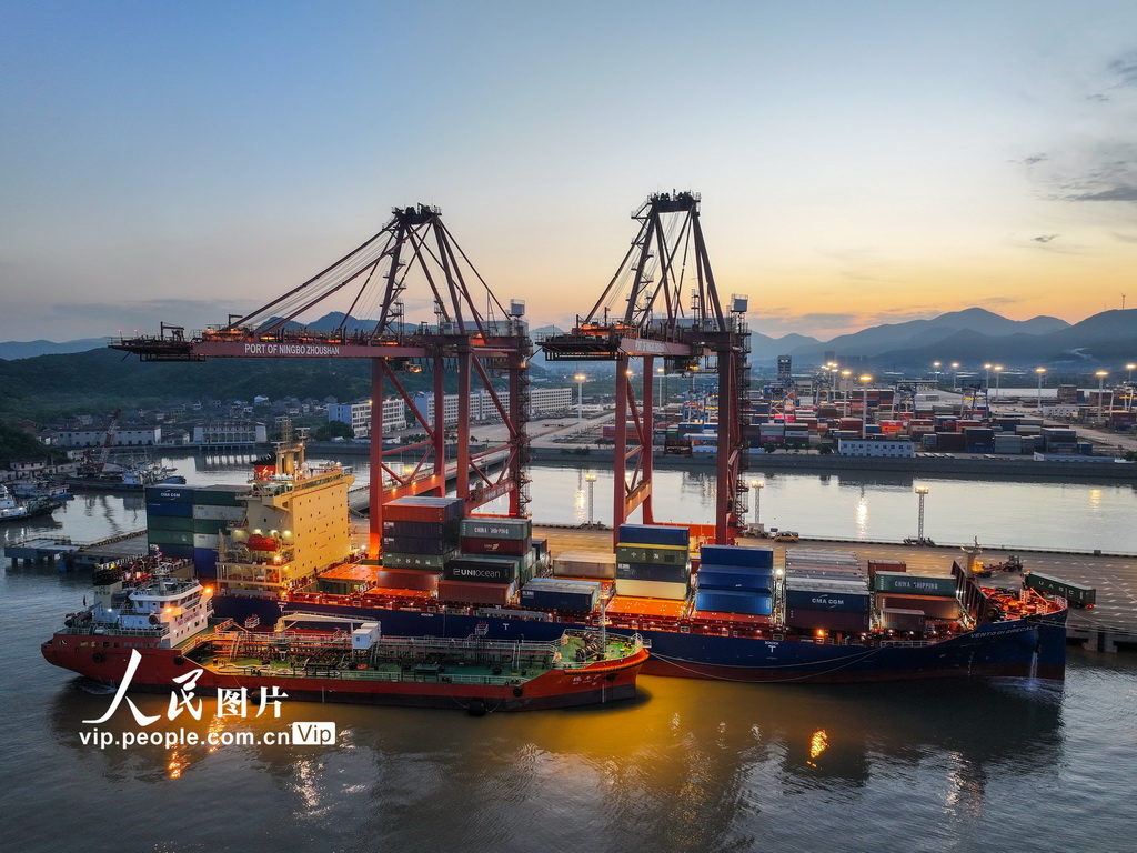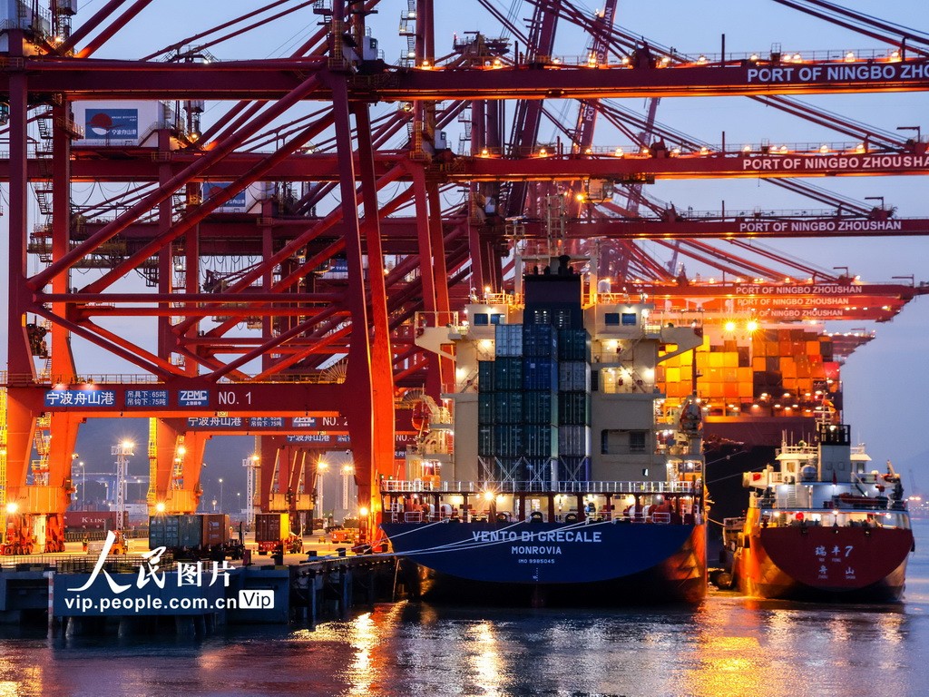 2024年5月2日晨,浙江宁波舟山港金塘大浦口集装箱码头灯火辉煌作业繁忙。姚峰摄(人民图片网)
