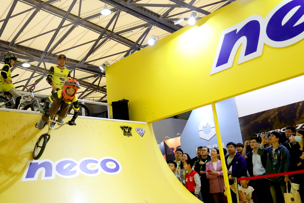 5月5日,一位小运动员在展会现场进行自行车U型道特技表演。新华社记者 方喆 摄