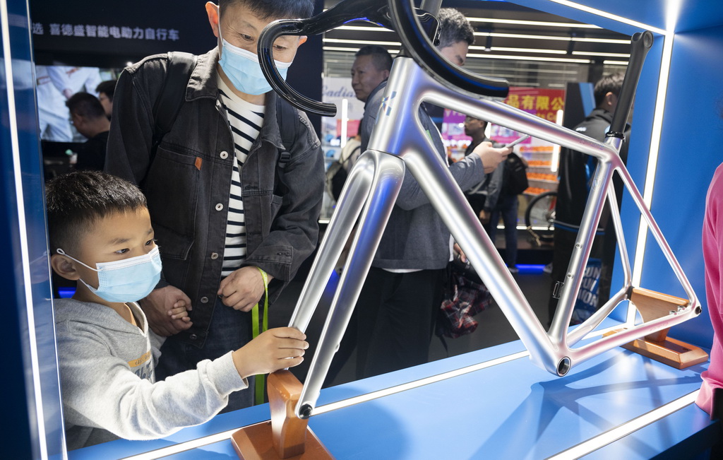 5月5日,参观者在喜德盛展台观看一款车架。新华社记者 才扬 摄