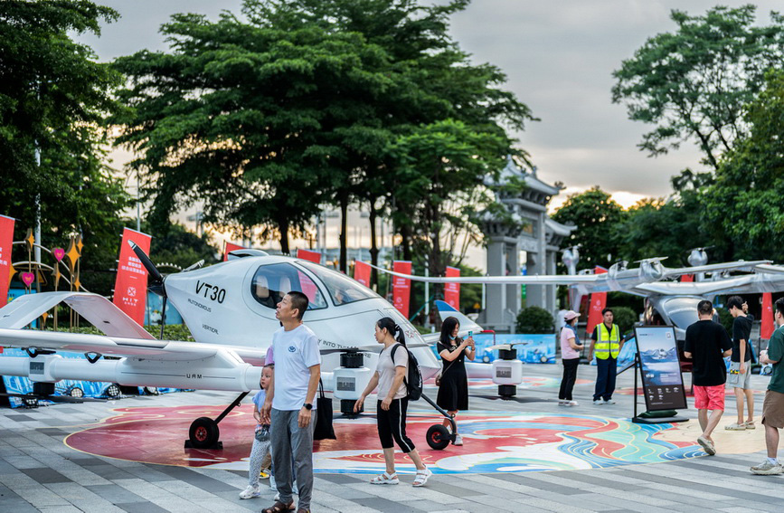 近日,一场低空航展在广州天德广场举行,十余架明星eVTOL(电动垂直起降飞行器)机型集中亮相,进行静态展示。日前广州发布《广州市低空经济发展实施方案》,本次航展是国内低空经济相关企业助力推动广州成为国内首个载人飞行商业化运营城市的积极行动。新华社记者 刘大伟 摄