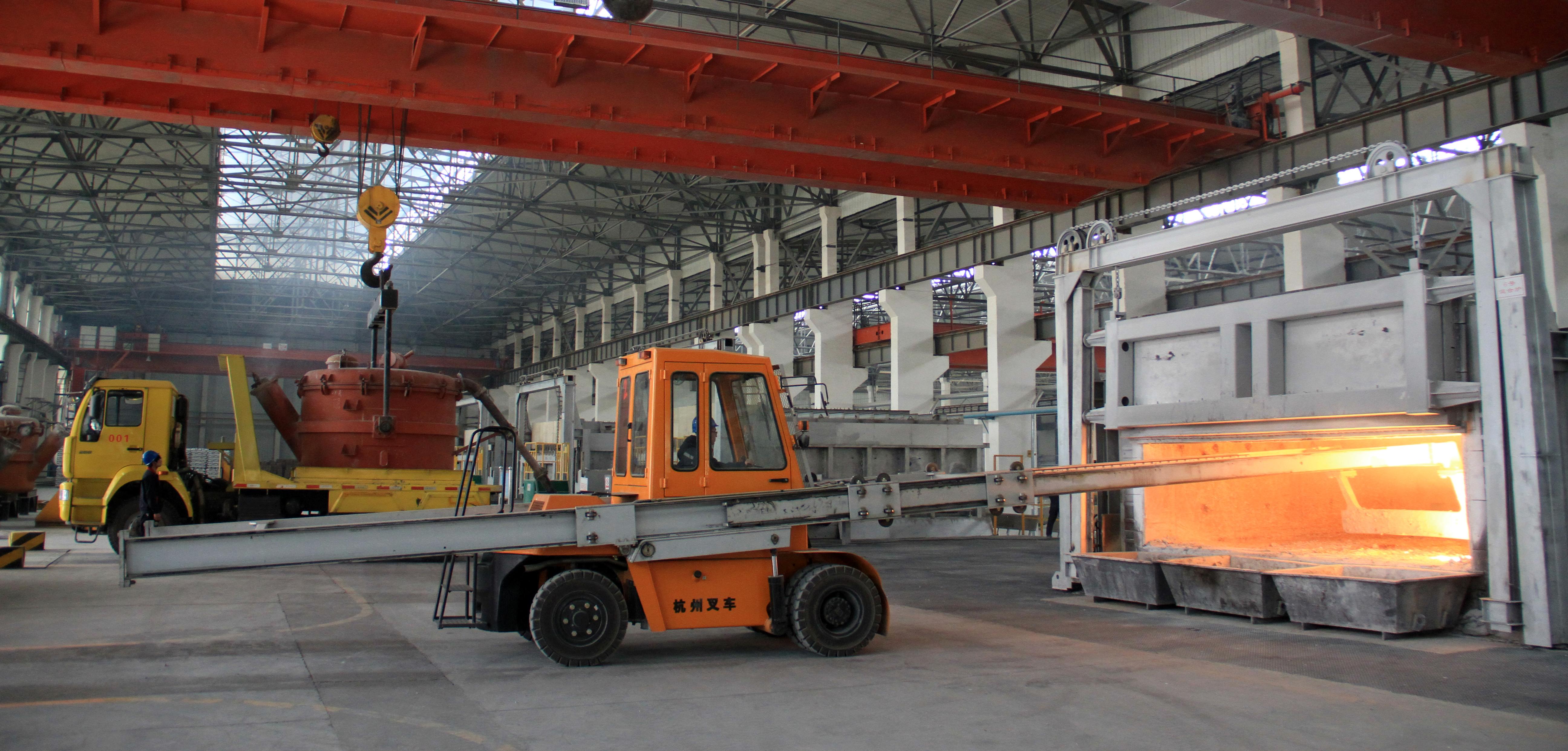 陕西有色榆林新材料集团铝业分公司铸造车间工人正在进行扒渣作业