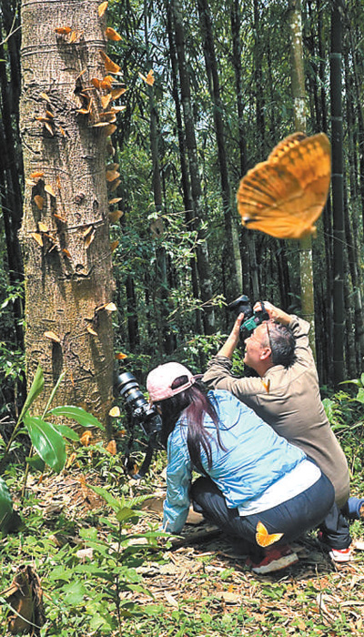 蝴蝶虽然少了些,但是游客更多了。探访的途中,记者看到不少游客在赏蝶、观景,一些游客特意身着当地特色服饰拍照留念。在一些角落里,还有不少摄影师正在蹲守,期望拍到珍稀品类蝴蝶。据介绍,今年的最佳观赏点是马拐塘林区、普家寨林区、牛场坪林区和营盘山林区等地,为了方便游客赏蝶,当地特意设计了旅游路线,并作了观赏期提示。