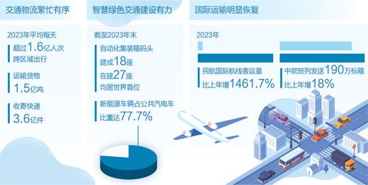 数据显示,去年我国完成营业性货运量547.47亿吨,比上年增长8.1%,完成货物周转量240646亿吨公里、增长6.3%。全年完成跨区域人员流动量612.88亿人次,增长30.7%,“大动脉”和“微循环”更加澎湃。