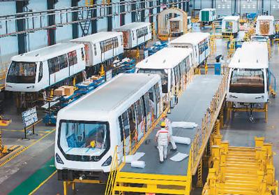 安徽省芜湖市抢抓共建“一带一路”高质量发展新机遇,积极培育轨道交通产业链集群。图为该市经济技术开发区的中车浦镇阿尔斯通运输系统有限公司车间里,工人在生产无人驾驶轨道列车。