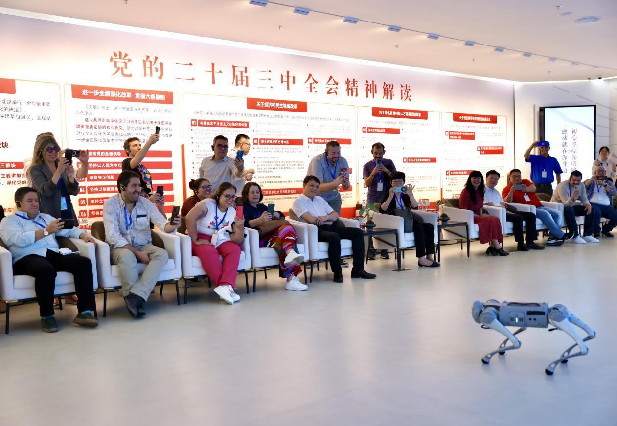 在现场,机器狗“吠云”跟随工作人员“前进”“后退”“卧倒”等指令,“标准”完成一个个动作,一段富有节奏感的“机械舞步”更是令采访团成员纷纷举起手机,抓拍记录精彩瞬间。