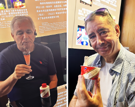 穿过历史的厚重,行至中国酒文化城的深处,参天古树旁有一座现代的建筑,陈列有各种样式的茅台酒,还有走创意混搭风的茅台鸡尾酒和茅台冰淇淋。果然懂创意的茅台更加光芒四射,来自欧亚各国的考察团成员都迫不及待地来上一杯,挖上一勺,用喝惯了伏特加、葡萄酒的味蕾感受来自东方特有的酱香风味。