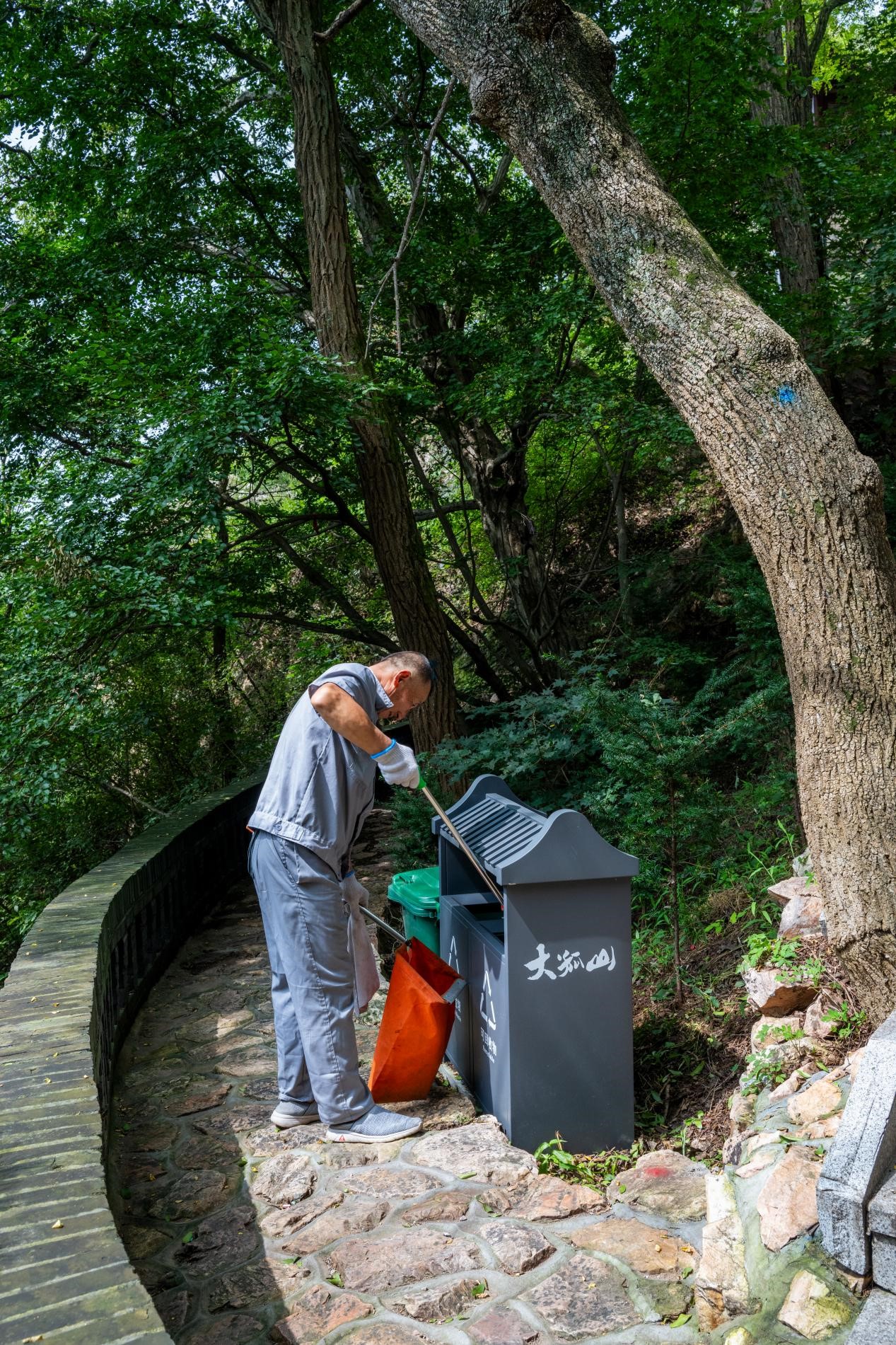 工作人员在大孤山景区清理垃圾。王哲 摄
