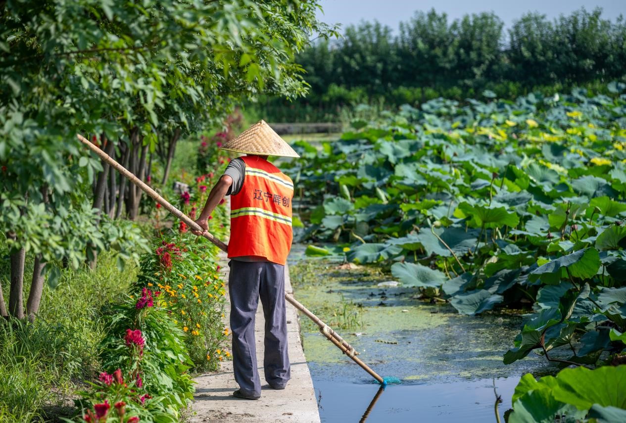 工作人员在孤山镇大姜家村清理荷花池。王哲 摄
