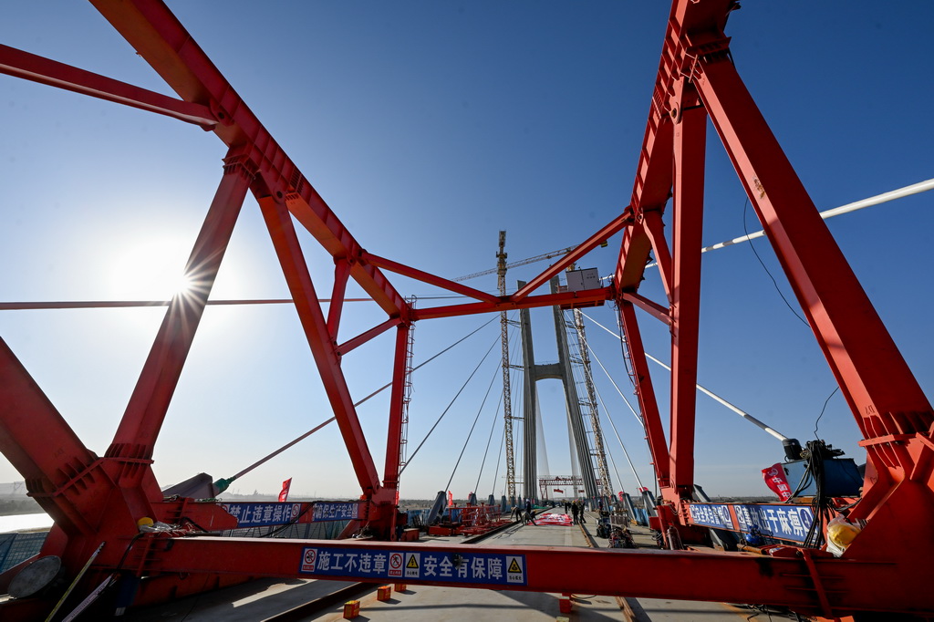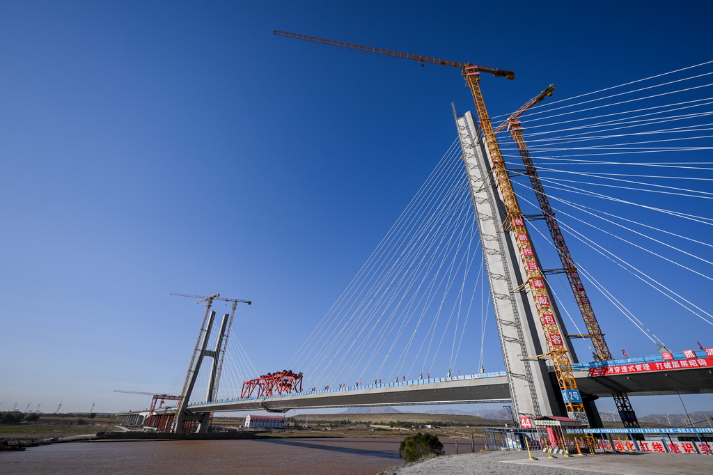 10月9日,包银高铁乌海黄河特大桥顺利合龙贯通,为线路早日建成通车迈出坚实一步。包银高铁是我国“八纵八横”高速铁路网京兰通道的重要组成部分,设计时速250公里,是西北地区连接东北、华北地区的交通大动脉和经济大通道。新华社记者 连振 摄