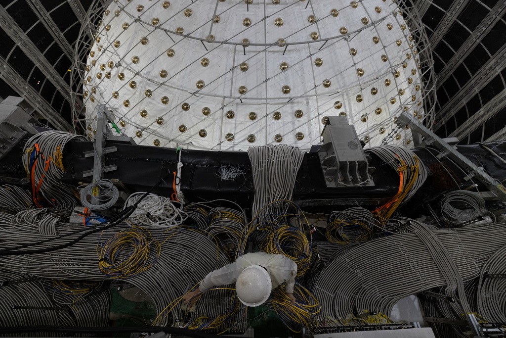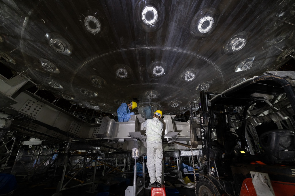 据中国科学院高能物理所消息,江门中微子实验建设目前已经进入收官阶段,最内层的有机玻璃球已合拢,外层的不锈钢网架和光电倍增管也在有序合拢中,预计11月底将完成全部安装任务。江门中微子实验以测量中微子质量顺序为首要科学目标,并进行其他多项重大前沿研究,建成后将成为国际中微子研究中心之一。新华社记者 金立旺 摄