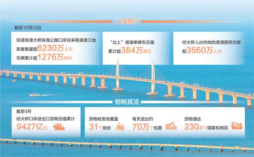 时空距离缩短,生活半径扩大。地理优势叠加口岸24小时便利通关特性,带动大湾区“一小时生活圈”成为现实。截至10月22日,“北上”港澳单牌车总量已累计超过384万辆次;经大桥入出内地的港澳居民总数已超过3560万人次。