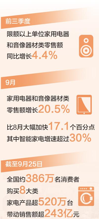 截至9月25日,全国约386万名消费者购买8大类家电产品超520万台,享受46.7亿元中央补贴,带动销售额超243亿元。