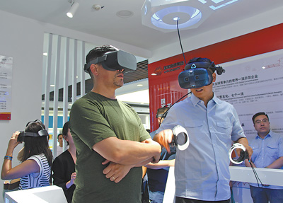 国际青年代表在玉门风电场VR电力安全生产实训室体验。