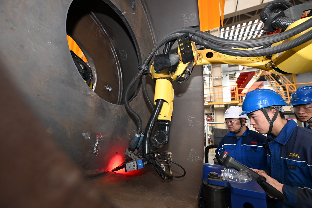 10月30日,工作人员在海油工程天津智能制造基地制管作业车间调试一款焊接机器人。