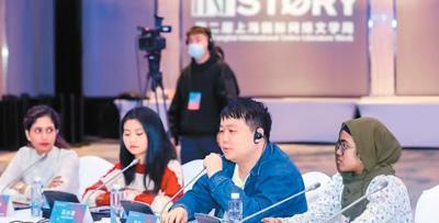 在2023年第二届上海国际网络文学周中外作家圆桌会上,李陈鑫(右二)向14位来自世界各国的网络文学作者分享科幻创作的心得。