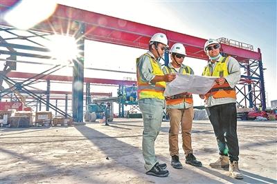 中国工程师在沙特国王港项目现场研究施工图纸。