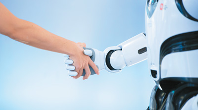 在深圳市优必选科技股份有限公司总部,工作人员与熊猫机器人“优悠”握手。