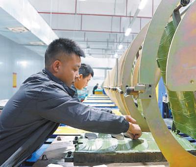 泉州市星达鞋服材料有限公司员工在高温热压塑形生产线作业。