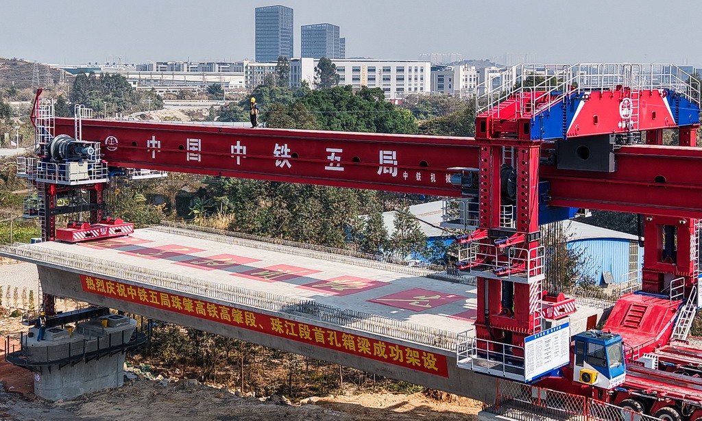 1月21日,珠肇高铁高肇段和珠江段首孔箱梁在肇庆市高要区双金河特大桥桥墩上成功架设。