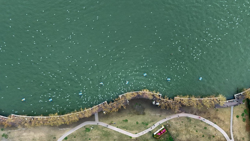 2月15日,市民游客在滇池边喂红嘴鸥(无人机照片)。