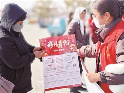 图为宁夏盐池县青年志愿者给乡亲们发放移风易俗宣传单。