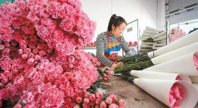 工作人员在昆明云舍花卉有限公司包装鲜花。