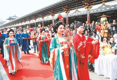 湖北省襄阳市唐城景区举行汉服婚礼秀,吸引了众多游客观看。