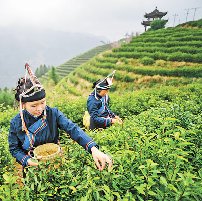 畲族居民在茶园采摘惠明茶。