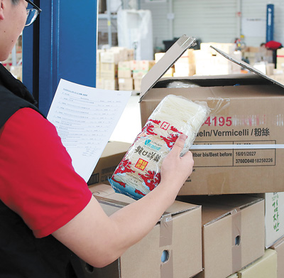 图为东方超市员工在清点刚运抵货运中心的龙口粉丝。作为中国最早与欧盟互认的地理标志产品之一,龙口粉丝一直深受德国顾客的青睐。