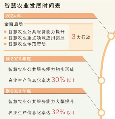 去年10月,农业农村部印发的《全国智慧农业行动计划(2024—2028年)》提出:到2026年底,智慧农业公共服务能力初步形成,农业生产信息化率达到30%以上;到2028年底,智慧农业公共服务能力大幅提升,信息技术助力粮油作物和重要农产品节本增产增效的作用全面显现,农业生产信息化率达到32%以上。