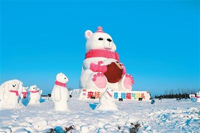 以蔓越莓为原型的文旅IP“莓莓熊”雪雕。