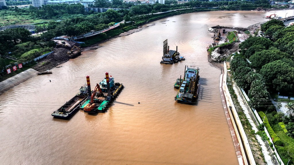 施工队在疏浚平陆运河航道(8月24日摄,无人机照片)。