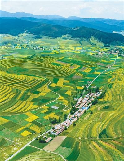 青海省西宁市大通回族土族自治县,油菜花与麦田交错嵌套,成为一道亮丽的生态美景。