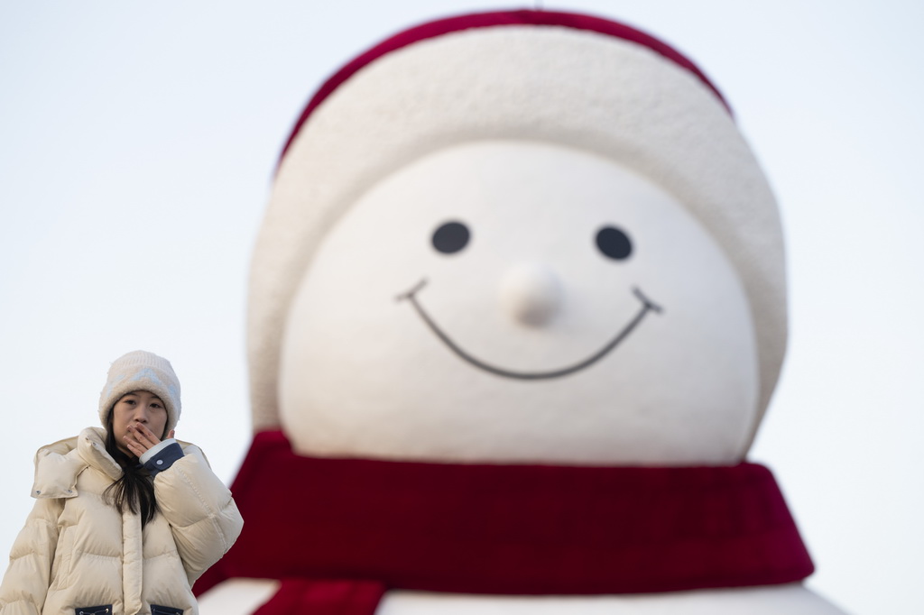 12月15日,游客在哈尔滨市群力音乐公园大雪人前合影。新华社记者 张涛 摄