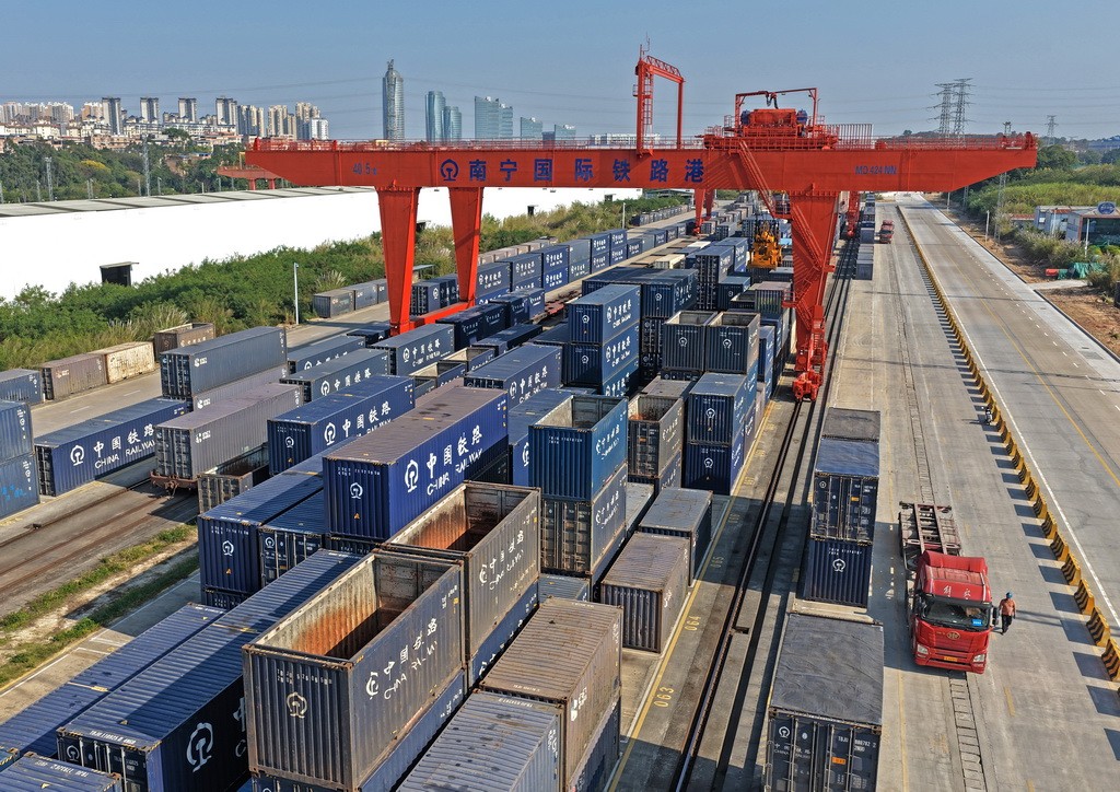 近日,记者从国铁南宁局获悉,2025年西部陆海新通道班列发运集装箱货物142.5万标箱,同比增长47.6%,首次实现年发运量突破百万标箱,再创历史新高。新华社记者 周华 摄