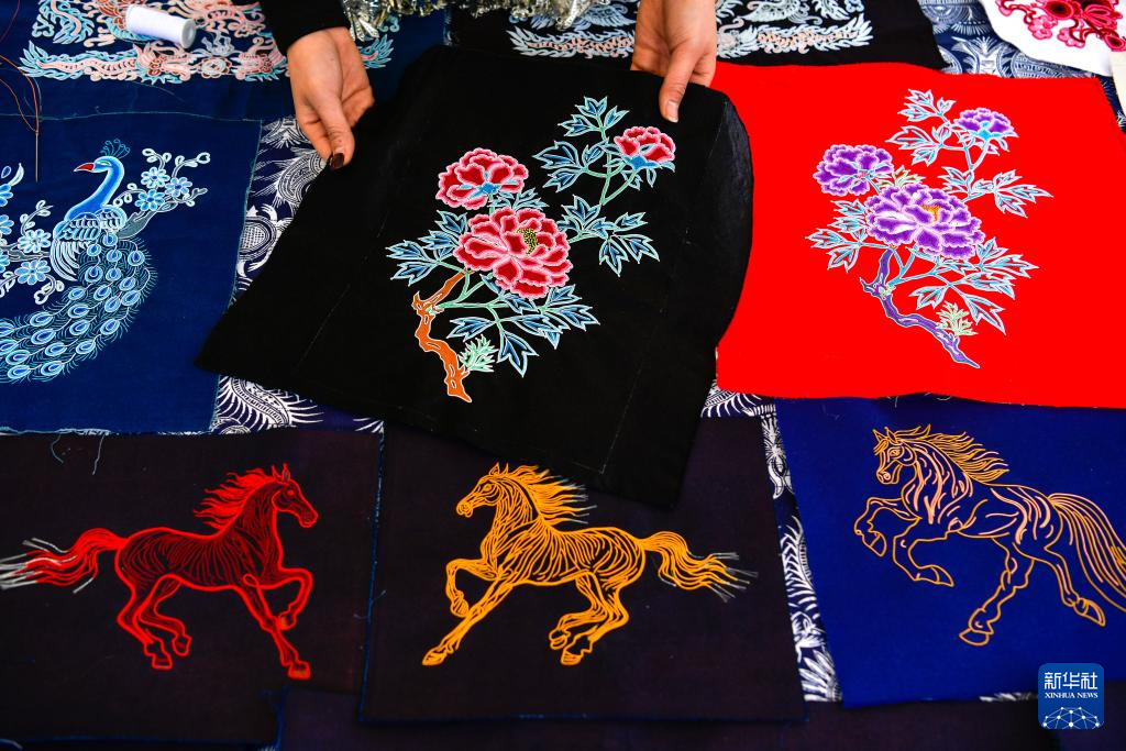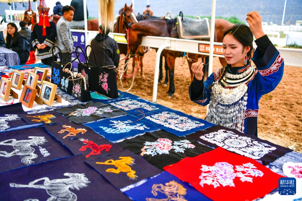 3月7日,绣娘在贵州省三都水族自治县“村马”比赛现场展示马尾绣。新华社记者 杨文斌 摄