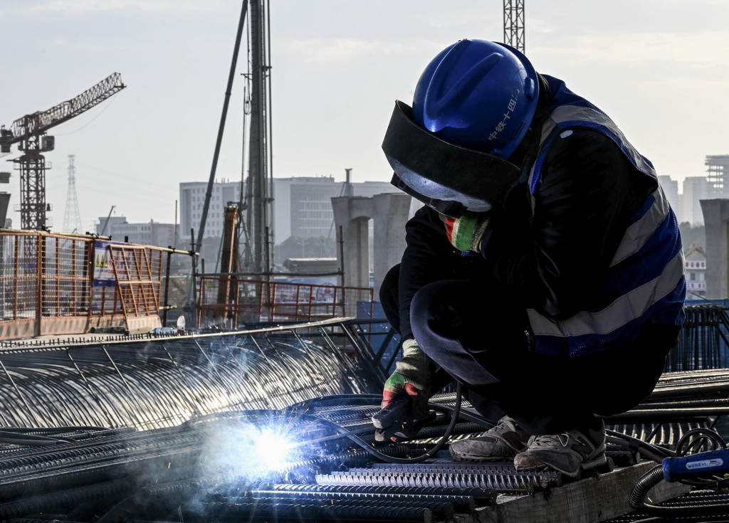 1月12日,中铁十四局工人在苏州东站集疏运系统及连接线工程现浇梁施工现场焊接。