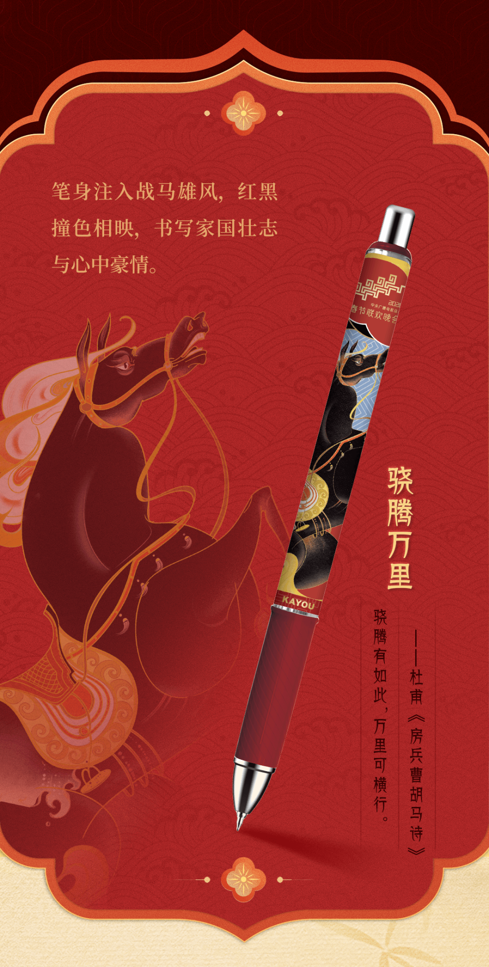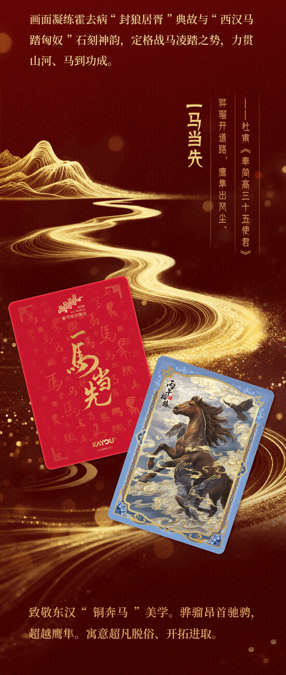 而这背后,是一代年轻人用自己的方式深入了解和传承传统文化。第三方数据机构报告显示,2025年总台春晚年轻用户参与度创新高,90后、00后占比66%,越来越多的年轻人成为主力观众。据报道,2026年,总台春晚首次向B站UP主敞开策划讨论的大门,邀请平均年龄不超过30岁的内容创作者参与共创。而“骐骥驰骋典藏卡”的创作团队,是曾推出《卡游三国》《长安三万里》《哪吒2》等卡牌产品的“Z世代”年轻画师们,他们的“创作动力源于不想让四大名著仅止于书本,不想让敦煌只在博物馆里,不想让昭陵六骏只刻于石上”。于是,今年这群年轻人把“春风得意马蹄疾”凝于卡面,把敦煌壁画白马带出莫高窟——就是为了让千年之美,能被握在手心。