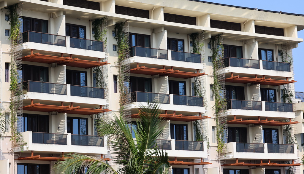 这是3月25日在博鳌近零碳示范区内拍摄的改造过后的博鳌亚洲论坛大酒店。博鳌亚洲论坛大酒店改造是建筑绿色化改造的项目之一,通过完善遮阳系统、增设垂直绿化、改善围护结构隔热性能、优化重构自然通风来减少用能强度,缩短用能时间。新华社记者 杨冠宇 摄
