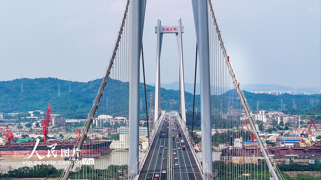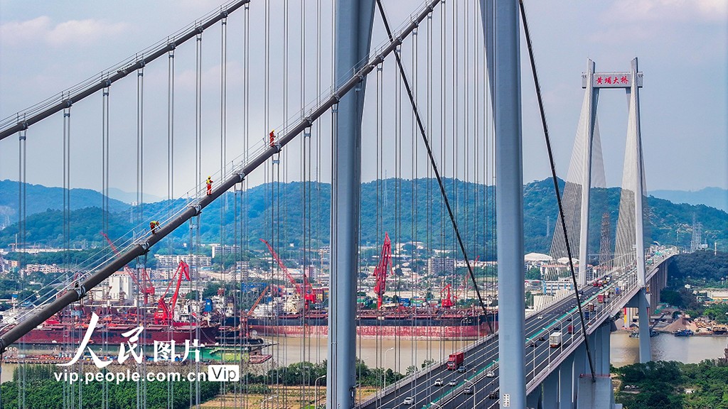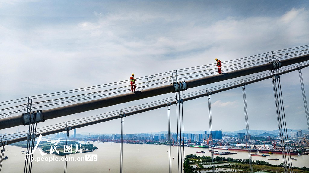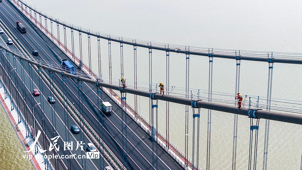 2024年4月16日,广州黄埔大桥工作人员正对悬索桥主缆索夹螺栓紧固和主缆检修道涂装防护工作。陈志强摄(人民图片网)